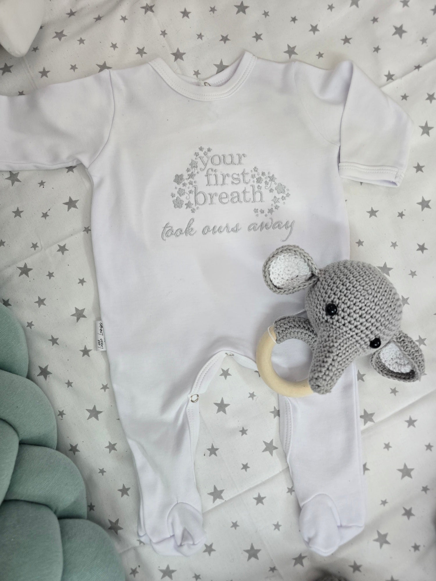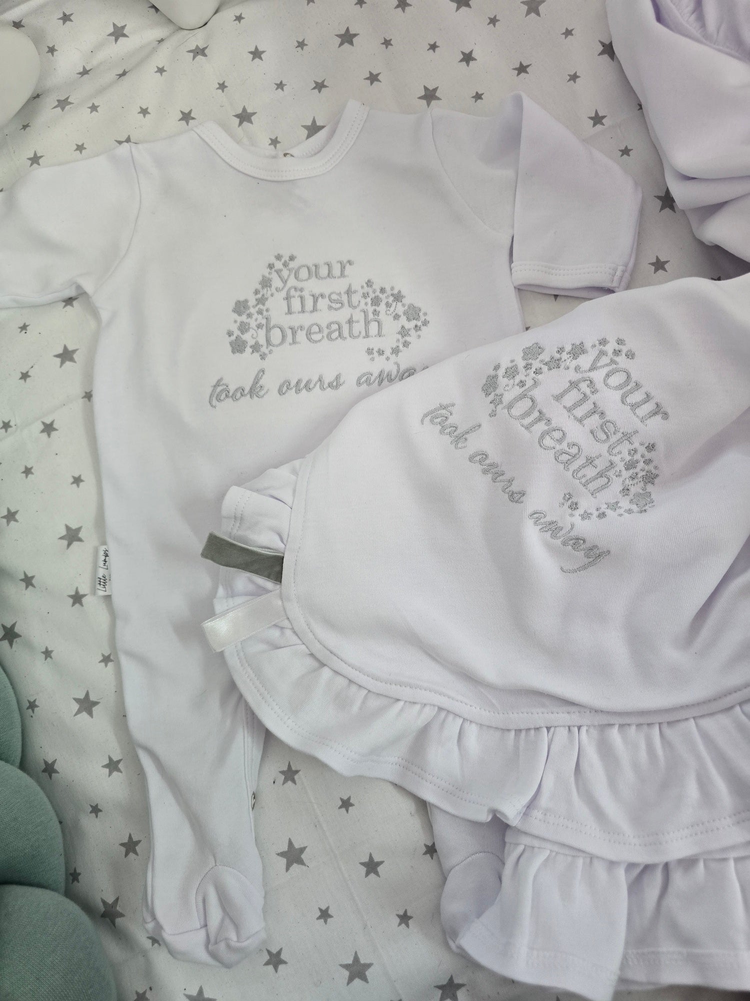Crafted from 100% soft cotton, the set includes a delicately frilled blanket for gentle warmth and comfort, paired with a classic baby grow featuring a back-neck opening for easy dressing. Embroidered across the chest are the heartfelt words “Your first breath took ours away” — a timeless sentiment that captures the magic of welcoming a new little soul.